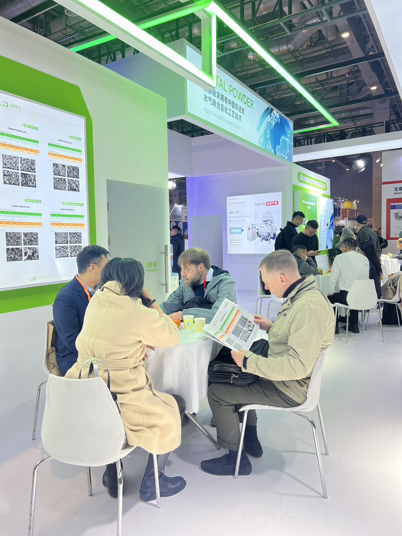 展位內(nèi)設(shè)置了多輪商務(wù)洽談環(huán)節(jié),客戶與技術(shù)團(tuán)隊圍坐交流,圍繞 MIM 粉末的選型、工藝優(yōu)化、量產(chǎn)適配等核心問題展開深入探討,現(xiàn)場合作意向滿滿。
